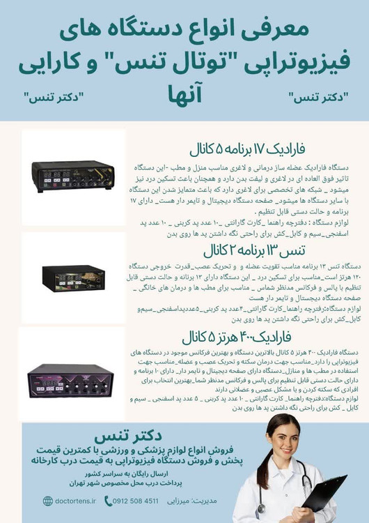 جریانات تنس فارادیک ای ام اس دی سی ای دی سی اف ای اس از جمله موارد استفاده سیاتیک دیسک کمر رباط تحریک عصب صدمات ورزشی تقویت عضله رفع اسپاسم عضلات بالا بردن گردش خون کتف و شانه فیله کمر و عضله ۴سر ران سکته و غیره...